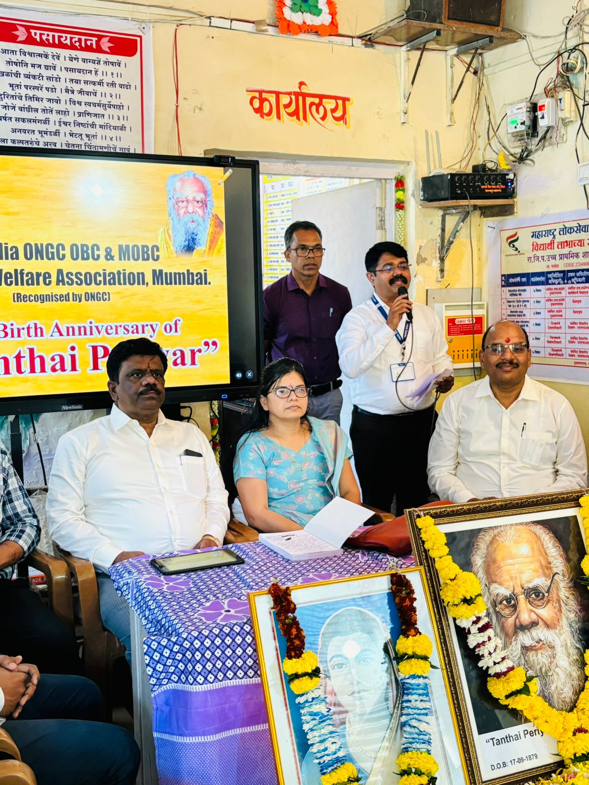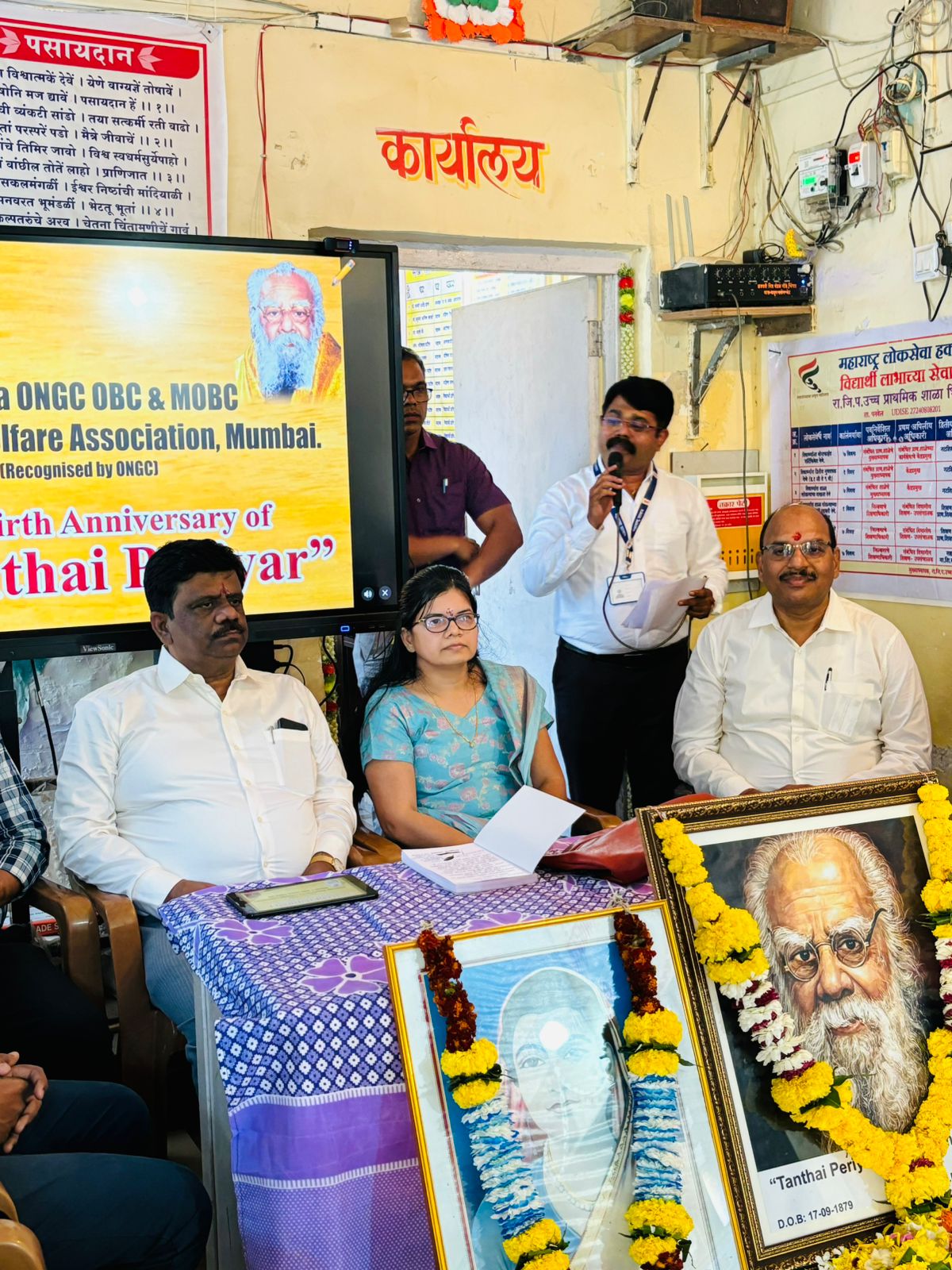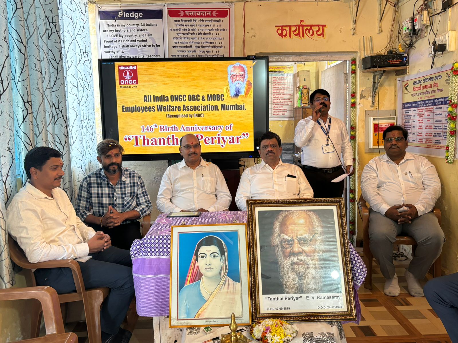 Chief Guest, ED-Asset Manager, MH Asset, Mr Ajay Kumar Sharma, were grace the occasion and Guest of honour’s Vivek Singh chand ED Asset Manager -Neelam & Heera, Ranbir Singh GGM Chief Geophysical Services, Rupjit Acharjya Head Geophysical Service and Deepak Swaroop Bhatnagar Surface Manager MH Asset and office bearer’s of AI OBC/MOBC Chairperson of OBC MOBC Ms. Swati Pawar, Vice Chairman- Shri. Santosh Patil & S L Pradhan, Secretary Shri. Dattaram Tawade , Joint Secretary BalkrishnaK. Choughule ,Org. Secretary Shri. Milind R. Gaikar,Shri. Shrikant G. Awar Treasurer Shri. Mahesh B. Vishwakarma along with CEC members Shri. Sandeep Revankar,Shri. Shrikant Harwande, Shri Vishwas H. Mhatre, Shri. Resham Shirgaonkar and senior level officer’s of Mumbai also attended the event in Vashudhara Bhavan Auditorium Mumbai. The program commenced with lighting of lamp and garlanding of portrait of Thanthai Periyar whose contributions to society and education continue to inspire generations followed by Chief Guest, ED-Asset Manager,Mr Ajay Kumar Sharma and AI OBC/MOBC Chairperson Mumbai Unit Ms. Swati Pawar address. Chairperson Mumbai Unit Ms. Swati Pawar delivered the welcome address and glimpsim of social reformer and founded the Self-Respect Movement and the Dravidian Kazhagam Thanthai Periyar Thoughts and his fundamental principles of rationalism, equality, humanism ,social justice, women’s rights, and the removal of the caste system.