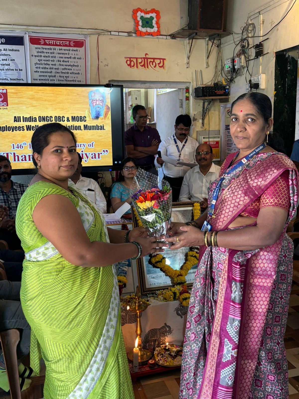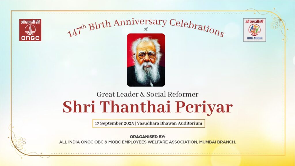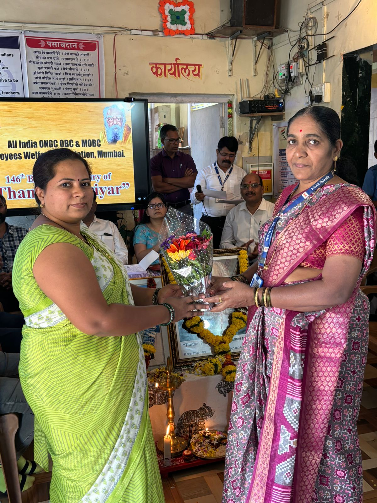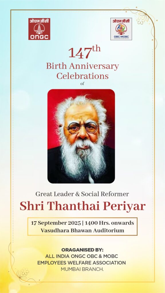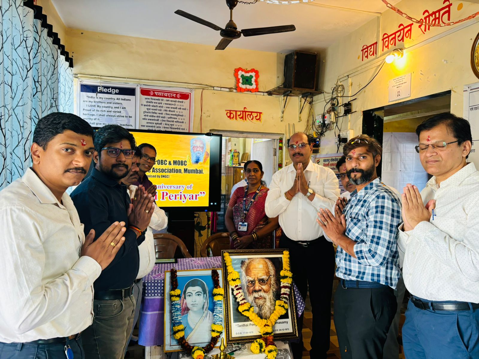 Chief Guest, ED-Asset Manager, MH Asset, Mr Ajay Kumar Sharma, were grace the occasion and Guest of honour’s Vivek Singh chand ED Asset Manager -Neelam & Heera, Ranbir Singh GGM Chief Geophysical Services, Rupjit Acharjya Head Geophysical Service and Deepak Swaroop Bhatnagar Surface Manager MH Asset and office bearer’s of AI OBC/MOBC Chairperson of OBC MOBC Ms. Swati Pawar, Vice Chairman- Shri. Santosh Patil & S L Pradhan, Secretary Shri. Dattaram Tawade , Joint Secretary BalkrishnaK. Choughule ,Org. Secretary Shri. Milind R. Gaikar,Shri. Shrikant G. Awar Treasurer Shri. Mahesh B. Vishwakarma along with CEC members Shri. Sandeep Revankar,Shri. Shrikant Harwande, Shri Vishwas H. Mhatre, Shri. Resham Shirgaonkar and senior level officer’s of Mumbai also attended the event in Vashudhara Bhavan Auditorium Mumbai. The program commenced with lighting of lamp and garlanding of portrait of Thanthai Periyar whose contributions to society and education continue to inspire generations followed by Chief Guest, ED-Asset Manager,Mr Ajay Kumar Sharma and AI OBC/MOBC Chairperson Mumbai Unit Ms. Swati Pawar address. Chairperson Mumbai Unit Ms. Swati Pawar delivered the welcome address and glimpsim of social reformer and founded the Self-Respect Movement and the Dravidian Kazhagam Thanthai Periyar Thoughts and his fundamental principles of rationalism, equality, humanism ,social justice, women’s rights, and the removal of the caste system.