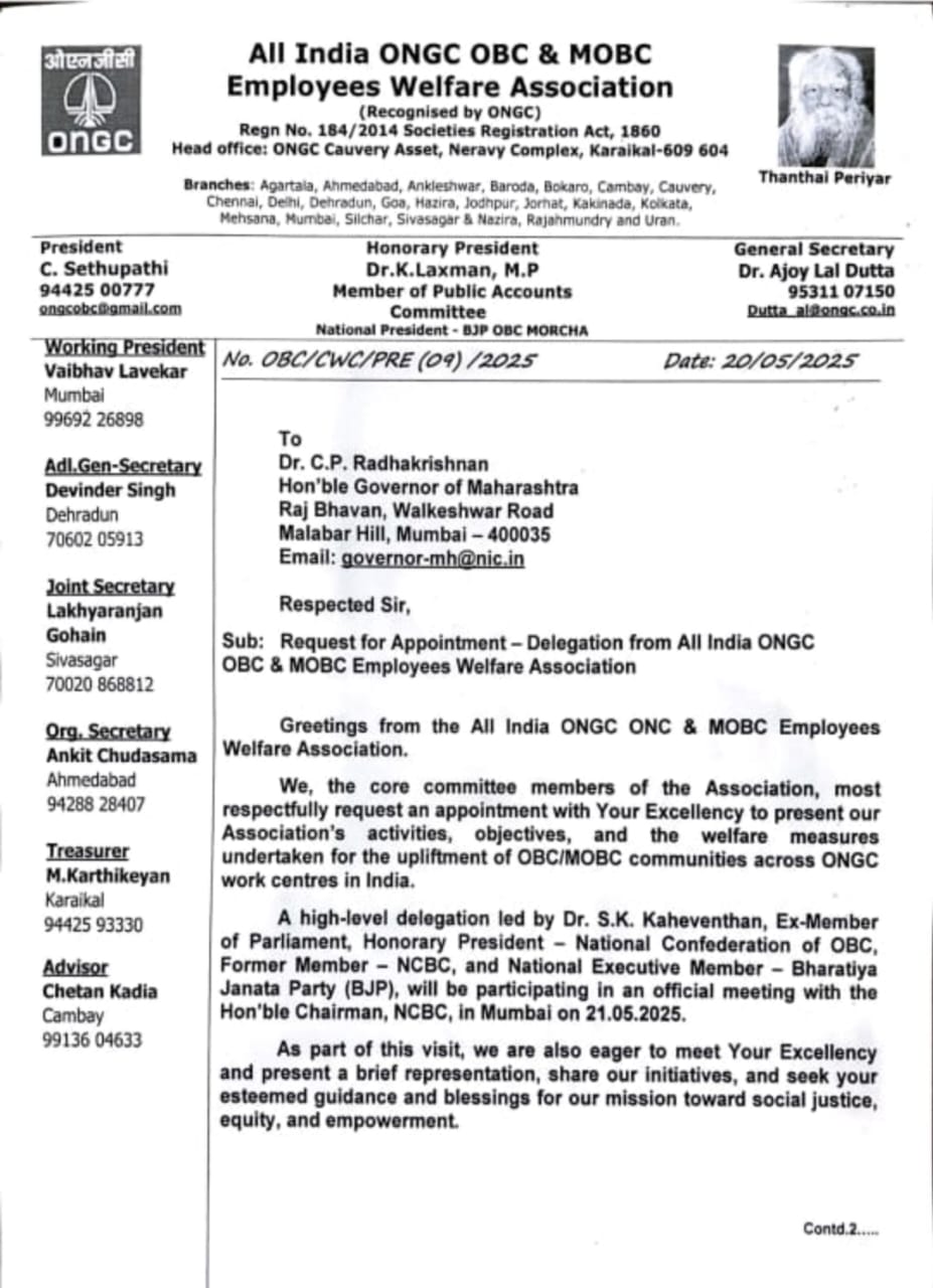 with regards CWC, All India ONGC OBCMOBCEWA & OBC MOBC Association Mumbai Branch.